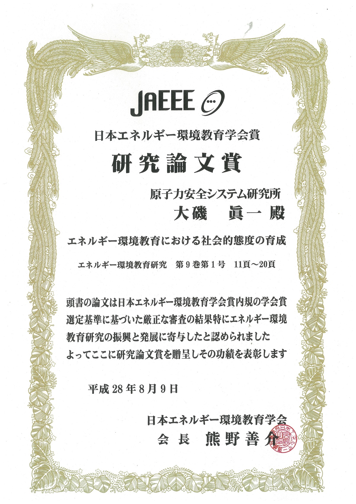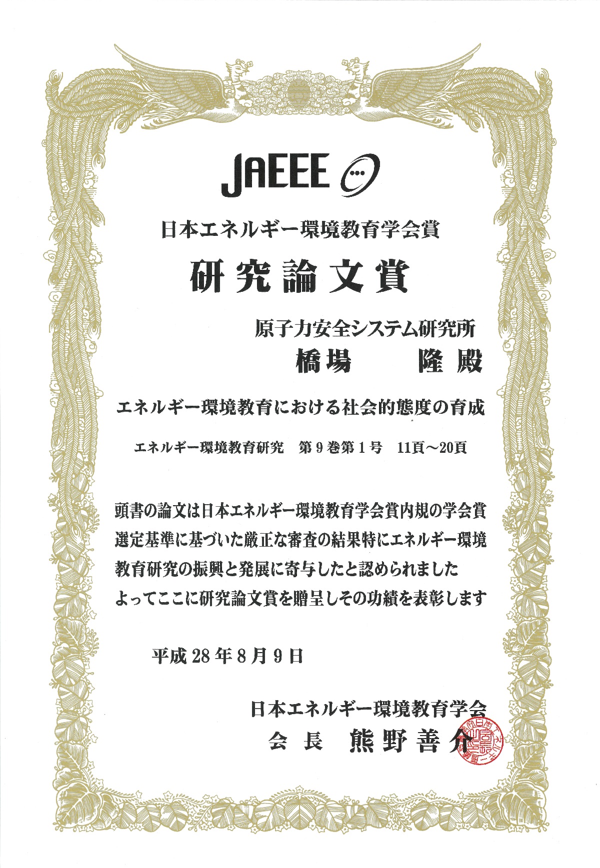 受賞対象論文:エネルギー環境教育における社会的態度の育成