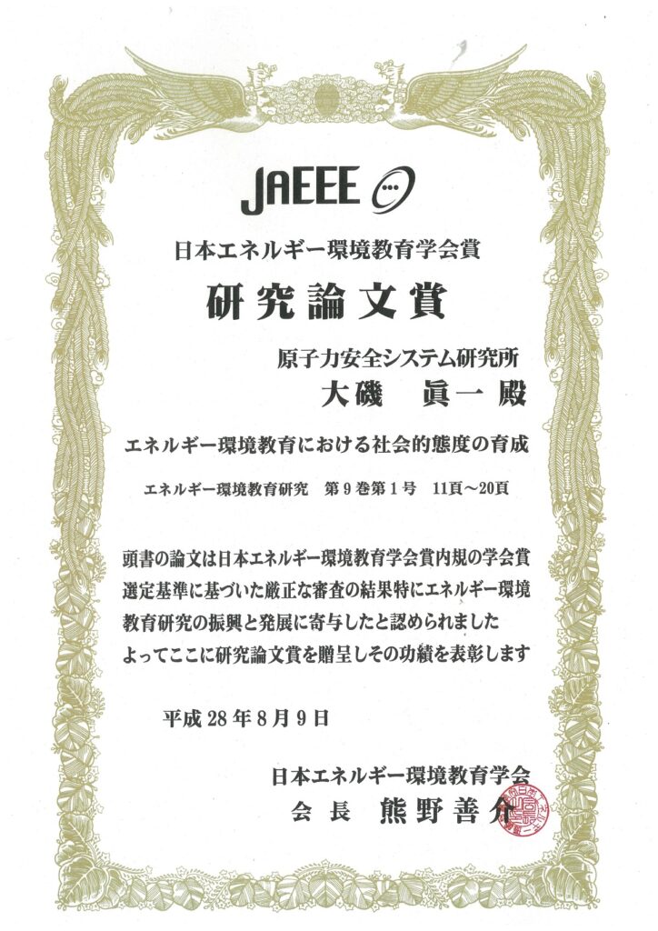2016年8月、札幌市立山の手小学校で開催された日本エネルギー環境教育学会 第11回全国大会において、所員2名を含む9名が「日本エネルギー環境教育学会賞研究論文賞」を受賞しました。