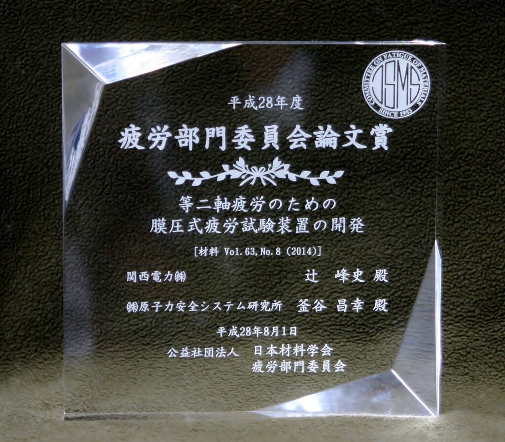 2016年8月、日本材料学会 疲労部門委員会論文賞を受賞しました。
