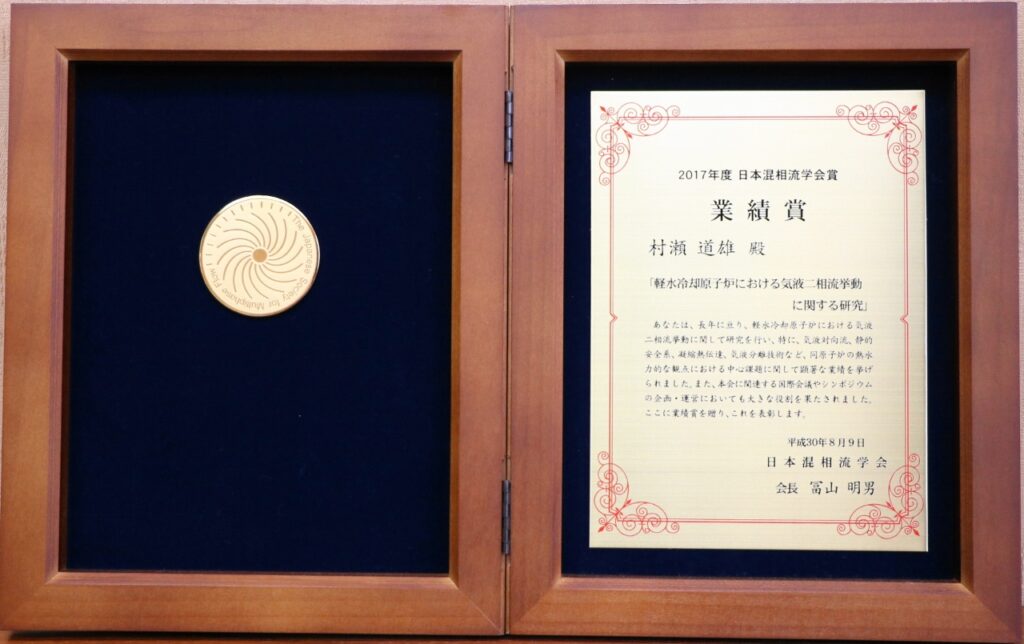 本賞は、日本混相流学会の発展に多大の貢献をなした会員、論文や著作が混相流の学問体系形成に顕著な貢献をなしたと認められる会員、混相流の特性を応用して技術の発展に顕著な業績を挙げた会員を対象に贈られるものです。 受賞者 : 技術システム研究所 主席研究員 村瀬 道雄 受賞対象となった研究 : 軽水冷却原子炉における気液二相流挙動に関する研究