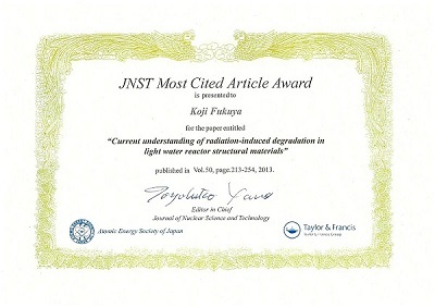 2020年3月、日本原子力学会において「The Journal of Nuclear Science and Technology Most Cited Article Award 2019」を受賞しました。